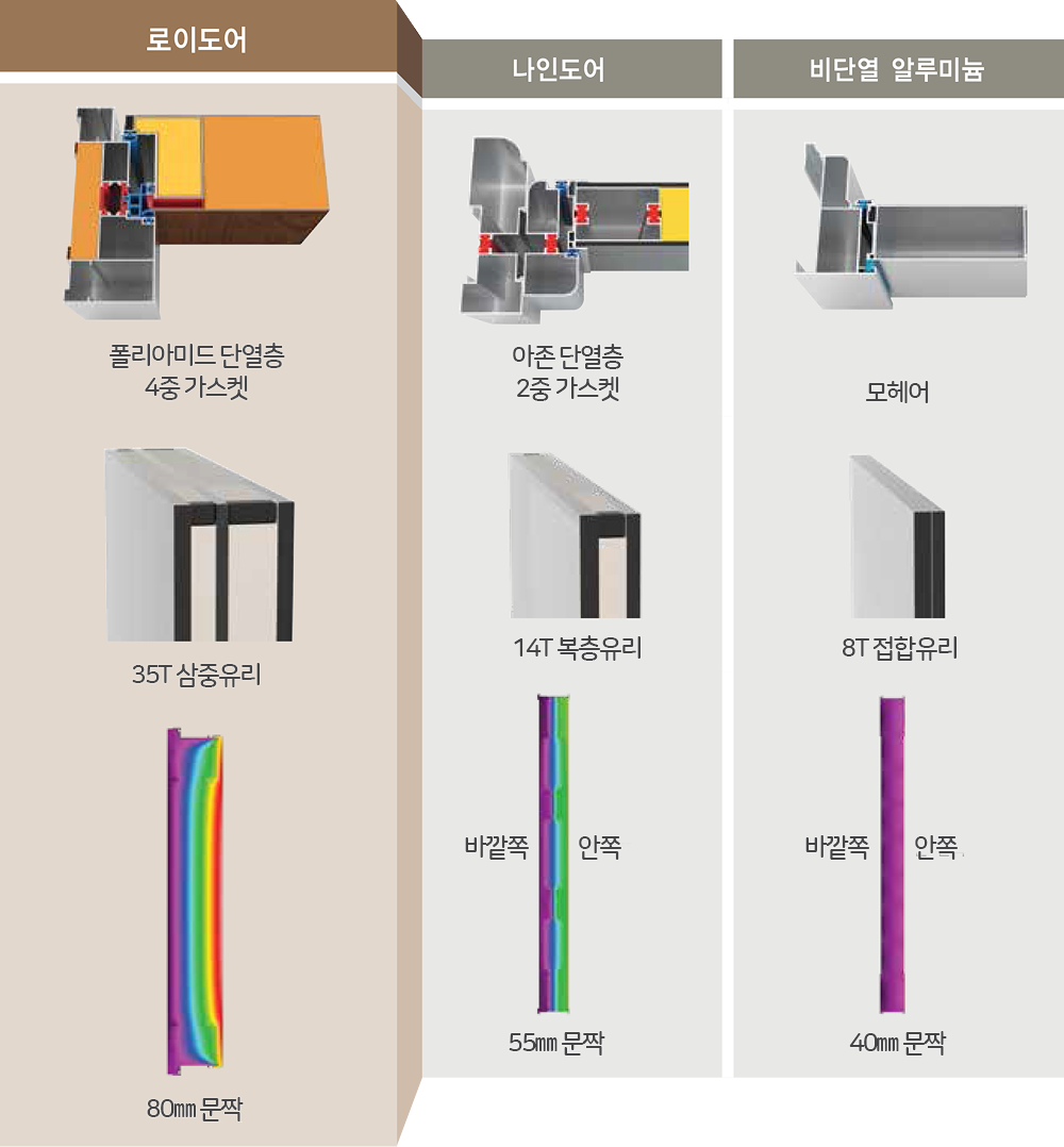 로이시리즈는 단열되는 후레 임 사이에 또 한번의 단열재가 벽을 타고 들어오는 열전도까지 잡아줍니다.